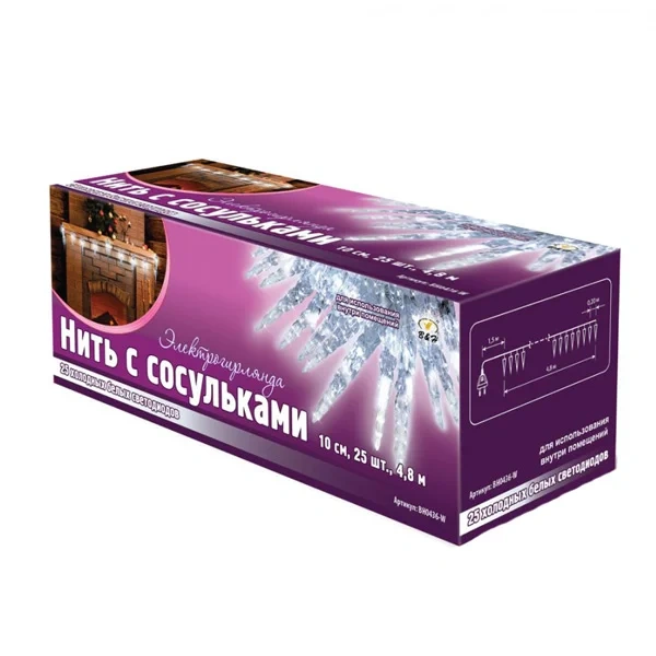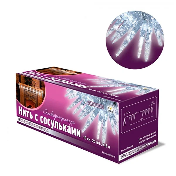 Электрогирлянда Нить с декором - сосульки, 25 холодных белых светодиодов, 4,8 м, длина насадки - сосульки 10см, длина сетевого шнура -1,5м, для использования внутри помещений, цвет провода - прозрачный.
