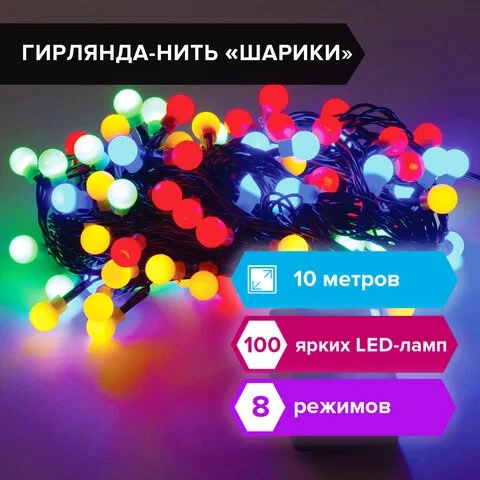 Гирлянда светодиодная внутренняя Золотая Сказка Шарики, 100 ламп, 10м, многоцветная