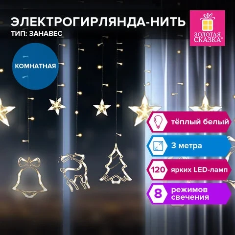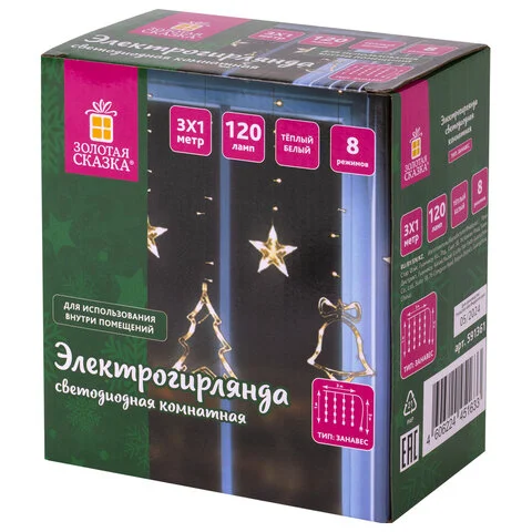 Гирлянда электрическая светодиодная ЗОЛОТАЯ СКАЗКА представляет собой светодиоды, соединенные электрическим проводом. Тип конструкции электрогирлянды - 'Занавес'. Данный тип конструкции предусматривает наличие основного провода рабочей части электрогирлянды без светодиодов, к которому перпендикулярно присоединены 12 нитей разной длины со светодиодами. Длина основного провода рабочей части гирлянды составляет 3 м, длина самой длинной нити со светодиодами - 1 м, длина кабеля питания - 3 м.