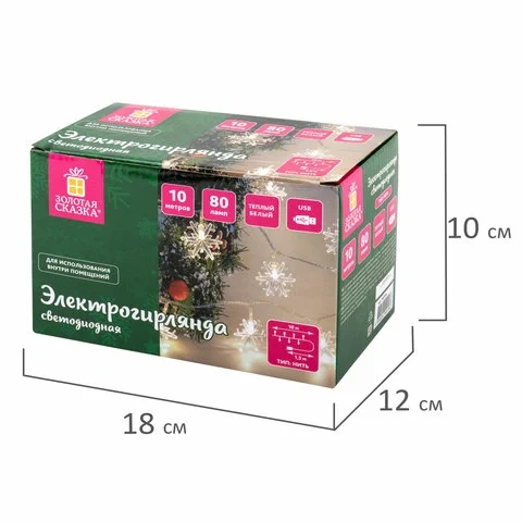 Электрическая светодиодная гирлянда представляет собой светодиоды, соединенные между собой электрическим проводом. Тип конструкции – 'Нить'. Длина рабочей части гирлянды составляет 10 м. Количество светодиодных ламп в виде 'снежинок' – 80 шт. Размер снежинки – 3,5 см. Лампы сделаны на основе технологии LED, которая является более безопасной и эффективной по сравнению с лампой накаливания.