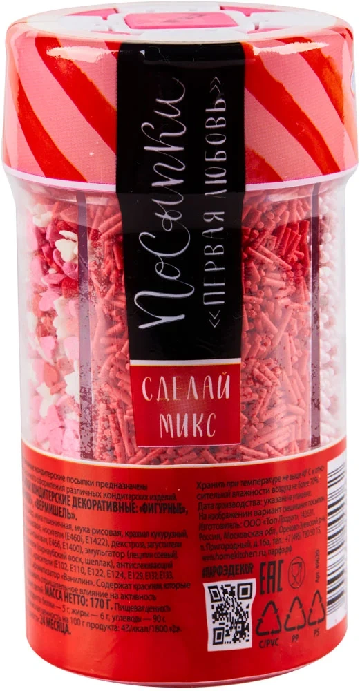 Пудра сахарная, декстроза, загуститель: дикрахмалфосфат, масло кокосовое рафинированное, сироп глюкозный, эмульгатор: эфиры глицерина и молочной и жирных кислот, пищевой краситель: диоксид титана, белок молочный, ароматизатор, агент антислеживающий: Е551. Может содержать следы глютена, молока, сои, яиц, кунжута и орехов.