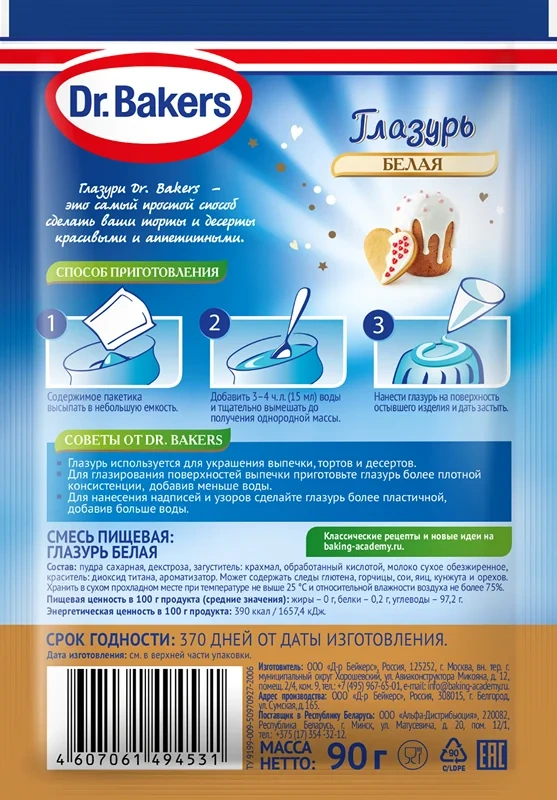 Белая сахарная глазурь прекрасно украсит выпечку для любого праздника! Печенье, кулич, торт или кекс – все будет смотреться наряднее и порадует ваших близких. Глазурь имеет нейтральный вкус и аромат и не отвлекает от основного вкуса выпечки. Приготовление – простое и удобное, необходимо только добавить воду.