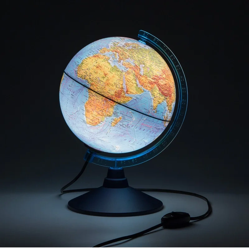 Глобус имеет подсветку, что позволяет комфортно использовать его в темное время суток. Лампочку внутри сферы при необходимости легко заменить.