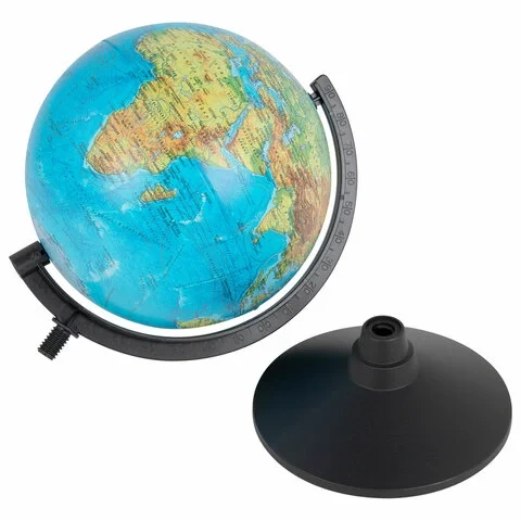 Глобус — идеальное учебное пособие для изучения географии в школе и дома. На карту глобуса нанесены страны, границы, города, континенты, моря, океаны, глубины и другая полезная информация. Подставка глобуса выполнена из высококачественного пластика чёрного цвета, земной шар обклеен пластиковой плёнкой. Размер глобуса: 32,5×23,5 см.