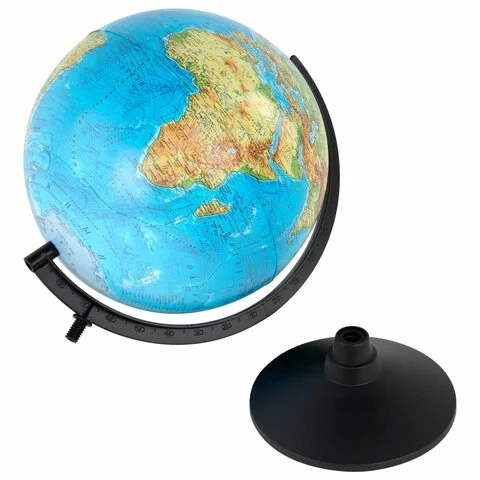 Глобус позволит ознакомиться с физической картой мира. Подходит для использования в детских садах и школах. Поможет узнать рельеф земной поверхности, абсолютные глубины океанов, найти самые высокие и самые глубокие места планеты.