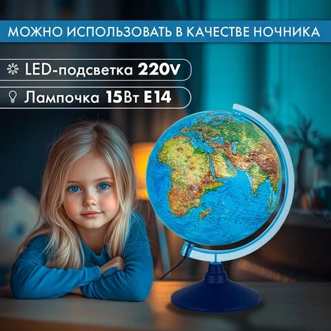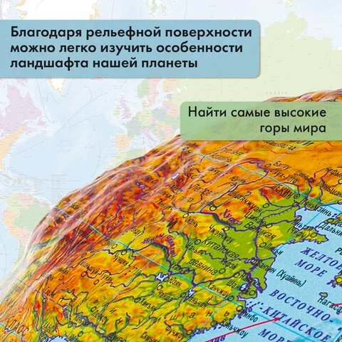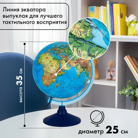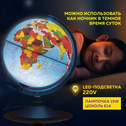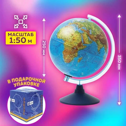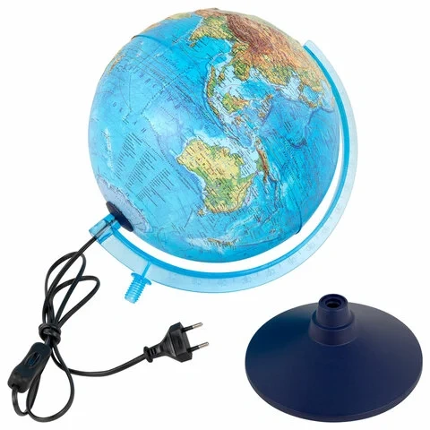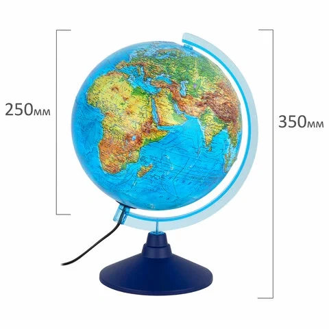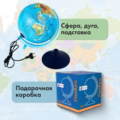 Глобус позволит ознакомиться с физической и политической картой мира. Подходит для использования в детских садах и школах. Поможет узнать об организационно-правовом (политическом) укладе территорий и рельефе земной поверхности.