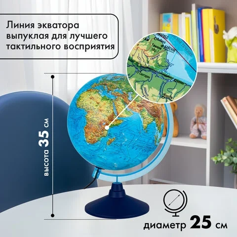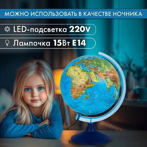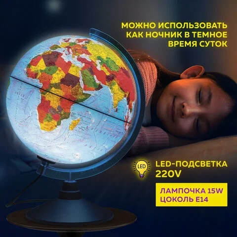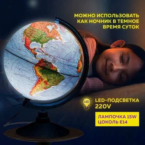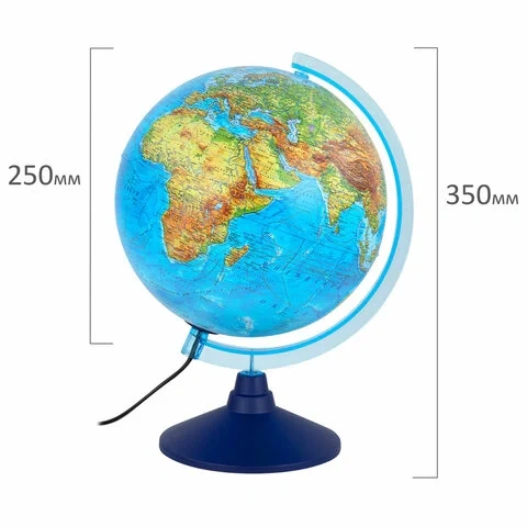 Размер глобуса 25 см, достаточно крупный с хорошо читаемыми надписями, удобен для размещения на рабочем столе. Глобус имеет подсветку, что позволяет комфортно использовать его в темное время суток. Лампочку внутри сферы при необходимости легко заменить.