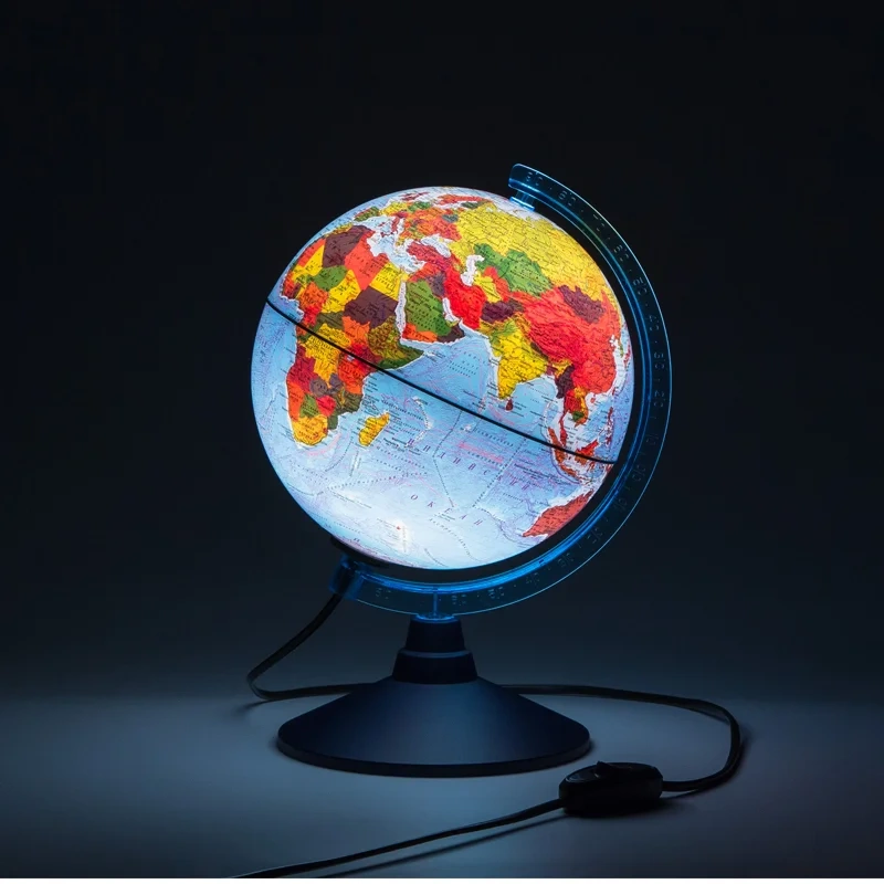 Глобус включает в себя две карты: с выключенной подсветкой вы видите физическую карту мира, при включении подсветки – политическую карту мира. Это делает глобус практичным и долговечным в использовании – пригодится школьнику для изучения окружающего мира, географии, истории и экономики.