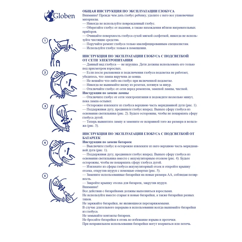 Компактный размер глобуса 21 см удобен для размещения на рабочем столе. Карта глобуса максимально подробная, все надписи легко читаются. Глобус имеет подсветку, что позволяет комфортно использовать его в темное время суток. Подсветка от батареек абсолютно безопасна – можно использовать глобус в качестве ночника. Подсветка работает от двух батареек АА, в комплект с глобусом не входят. Использованные батарейки внутри сферы при необходимости легко заменить.