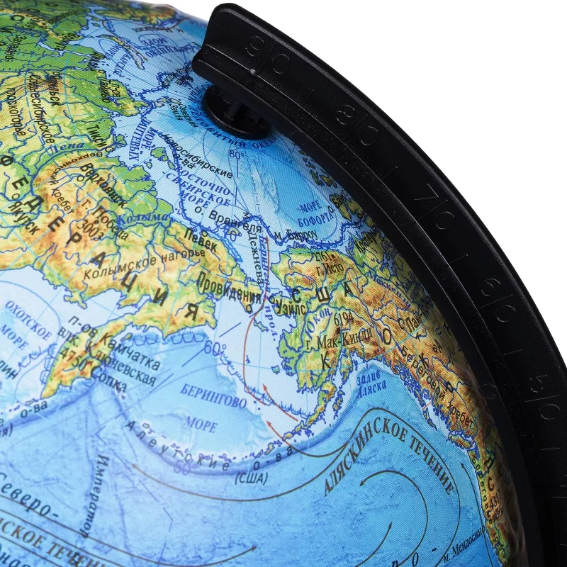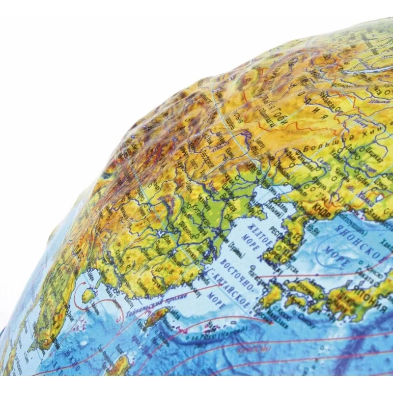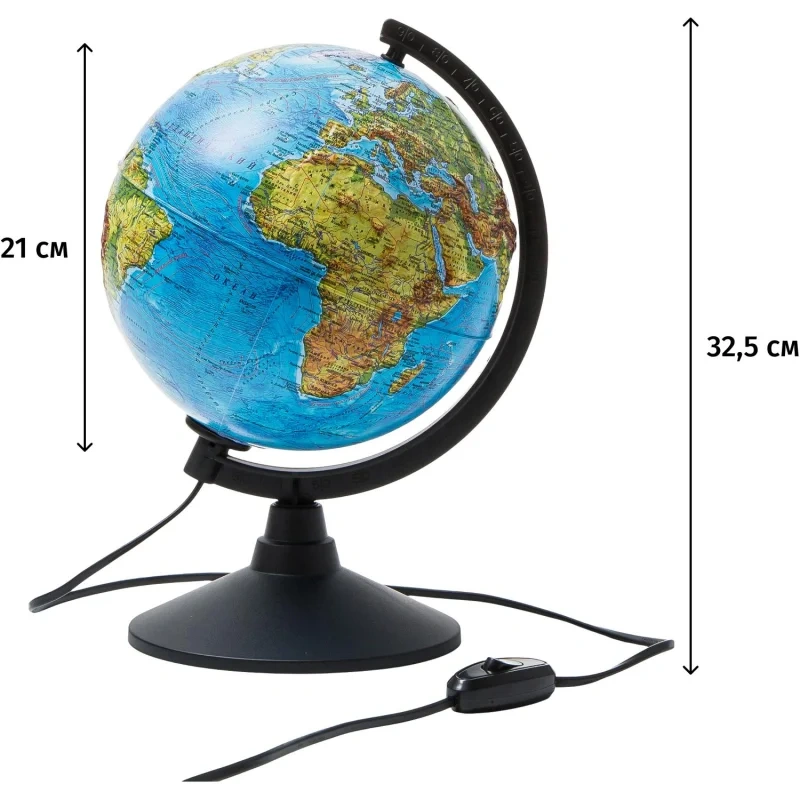 Глобус — идеальное учебное пособие для изучения географии в школе и дома. На карту глобуса нанесены страны мира, названия городов и другая полезная информация, а также детальный рельеф ландшафта. Рельефная поверхность отражена с помощью выпуклостей на поверхности глобуса. При включении подсветки глобус превращается в наглядную политическую карту: чётко выделяются границы стран, каждая из которых окрашена в свой цвет. В вечернее и ночное время глобус можно использовать как ночник. Подставка глобуса выполнена из высококачественного пластика чёрного цвета. Размер глобуса: 32,5×23,5 см. Питание от сети, в комплекте поставляется шнур с выключателем.