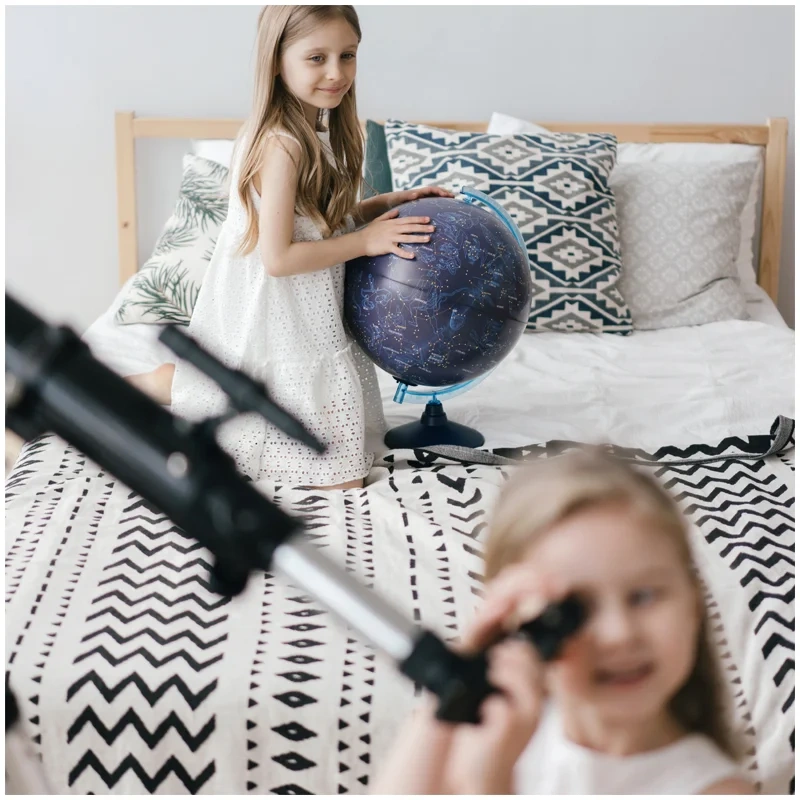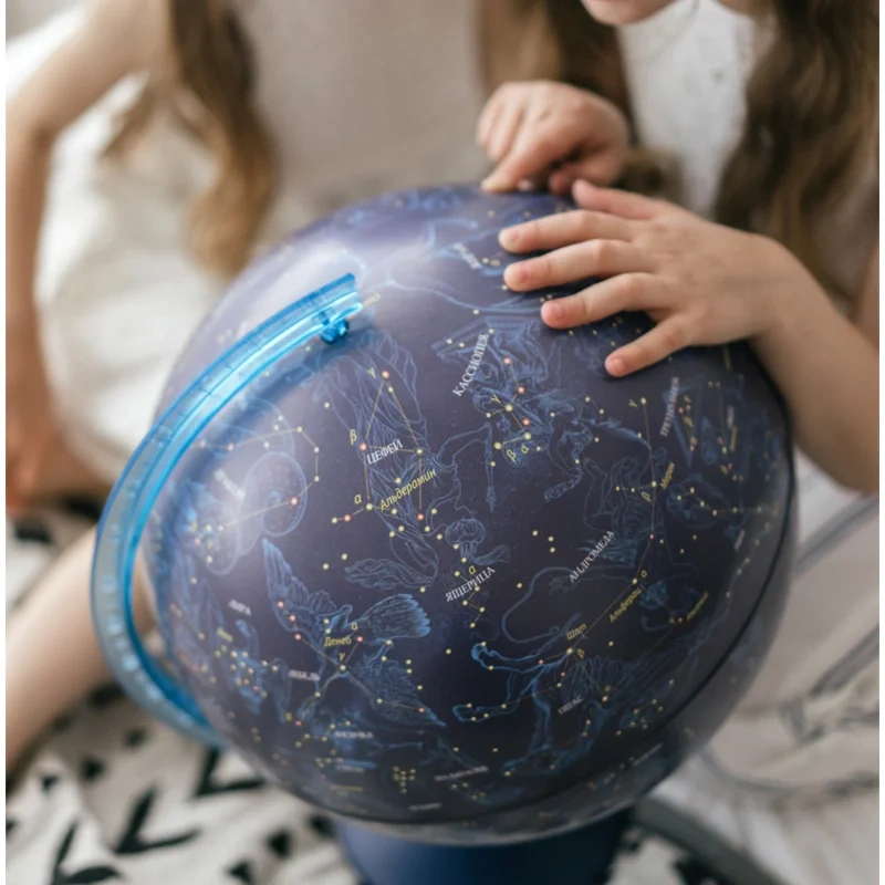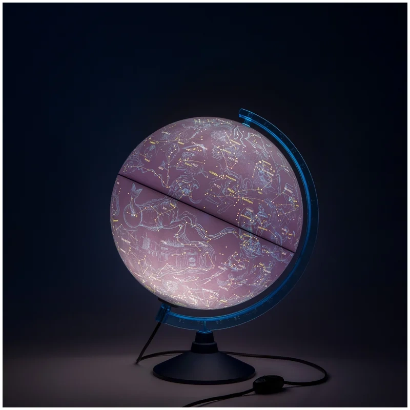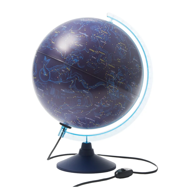 Глобус звездного неба – оригинальный подарок для всех, кто интересуется астрономией. На синей карте глобуса легко рассматривать и изучать созвездия, чтобы потом находить их на бескрайних просторах ночного неба. Диаметр глобуса 32 см – достаточно крупный, чтобы использоваться в индивидуальном порядке и для демонстрации в учебных классах. Карта глобуса максимально подробная, все надписи легко читаются. Глобус имеет подсветку от сети, что позволяет комфортно использовать его в темное время суток. Лампочку внутри сферы при необходимости легко заменить. Глобус выполнен из прочного высококачественного пластика с соблюдением всех современных технологий. Упакован в фирменную подарочную коробку.