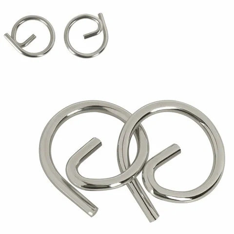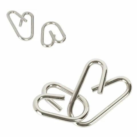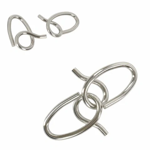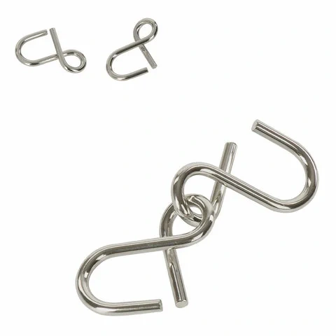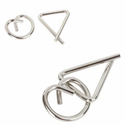 Металлический пазл представляет собой два элемента, изготовленных из стали диаметром 4,5 мм. Смысл решения головоломки в том, чтобы разъединить ее части, а затем соединить обратно. В дисплее 12 разных по сложности головоломок. Решение находится внутри коробки.