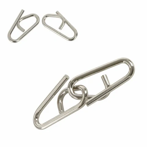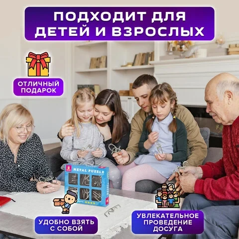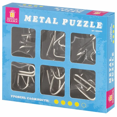 Металлический пазл представляет собой два элемента, изготовленных из стали диаметром 3,5 мм. Смысл решения головоломки в том, чтобы разъединить ее части, а затем соединить обратно. В коробке 6 разных головоломок, решение находится внутри.