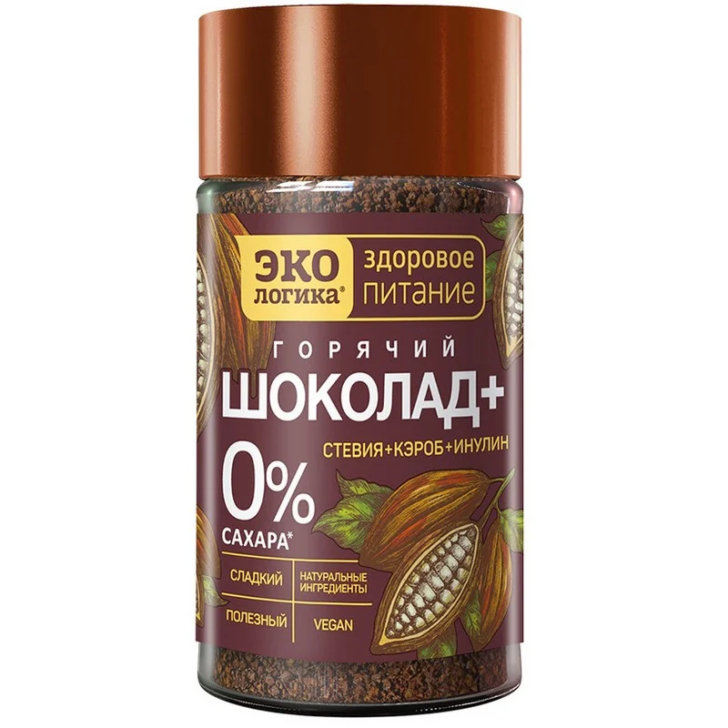 Горячий шоколад + содержит какао высшего качества, кэроб, пребиотик инулин, а также натуральные заменители сахара стевиозид и эритрит. Продукт отлично впишется в рацион здорового питания, веганов и людей с непереносимостью лактозы.