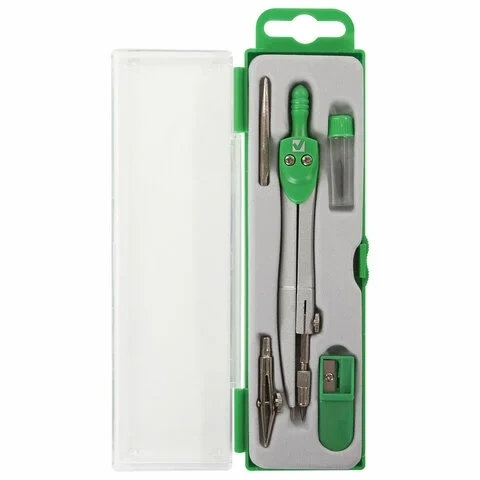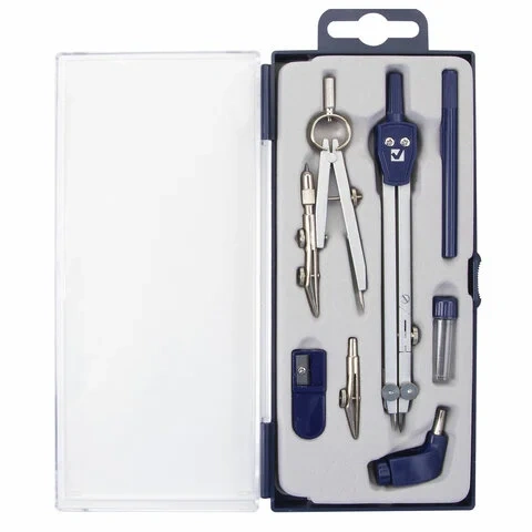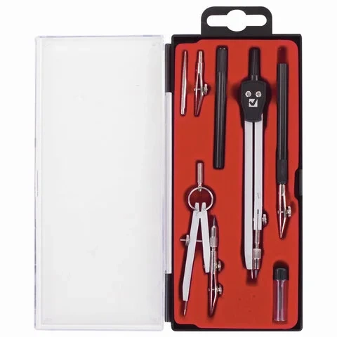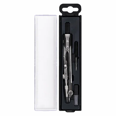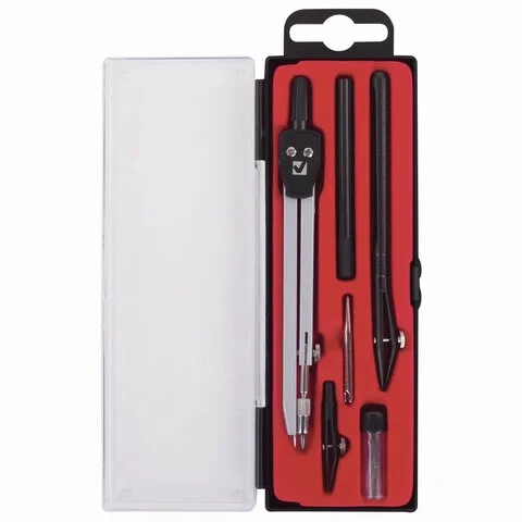 Готовальня в пластиковом пенале с прозрачной крышкой. Наполнение - 6 предметов. Металлический чертеж...