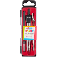 Набор в пластиковом пенале с европодвесом - 4 предмета (циркуль, запасной грифель, точилка и насадка с универсальным держателем). Товар предназначен для чертежно-графических работ.