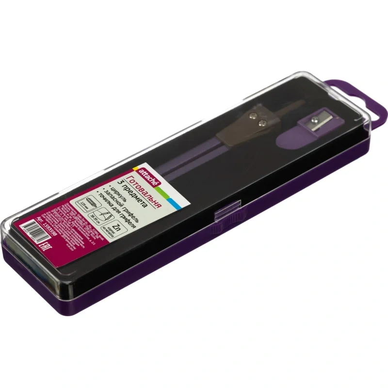 Готовальня Attache BF-A6 3пр/наб,циркуль 129мм,фиолет,пласт.пенал,европодв Набор чертежных принадлежностей из 3 предметов: циркуль (длина 129 мм), запасной грифель, точилка. Предназначен для школьников средних и старших классов, специалистов, архитекторов и конструкторов. Готовальня комплектуется ударопрочным пластиковым пеналом с европодвесом, что позволяет эффективно расположить товар и исключает повреждение во время транспортировки, а также сохраняет чертежные принадлежности исправными продолжительное время. 'В рамках ребрендинга производится перевод данного артикула с ТМ №1School на ТМ Комус Класс с сохранением всех потребительских характеристик товара. На переходный период допускается поставка данной продукции в двух вариантах дизайна.