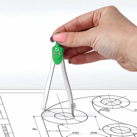 Циркуль длиной 115 мм имеет несгибаемые штанги. Изготовлен из металла, дополнительный цвет элементов - зеленый.