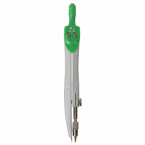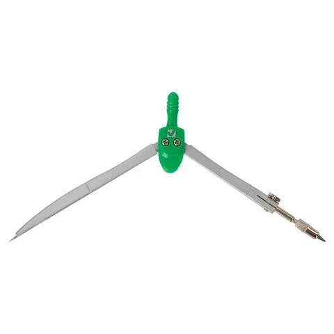 Циркуль длиной 125 мм имеет несгибаемые штанги. Изготовлен из металла, дополнительный цвет элементов - зеленый.