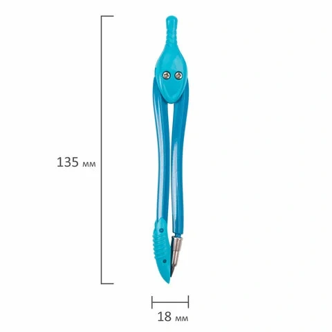 Циркуль длиной 135 мм имеет несгибаемые штанги и пластиковый защитный колпачок для иглы. Изготовлен из металла. Цвет - ассорти (без возможности выбора цвета).