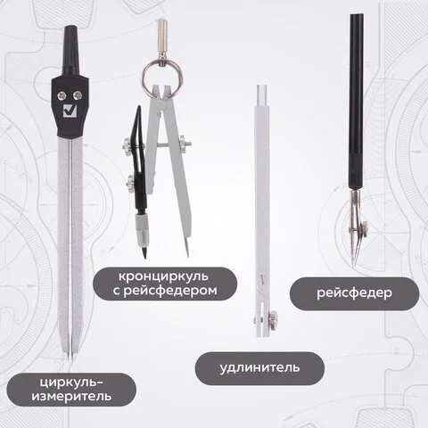| Комплектация | игольная вставка, кронциркуль, пенал с запасным грифелем, рейсфедер, рейсфедерная вставка и держател |