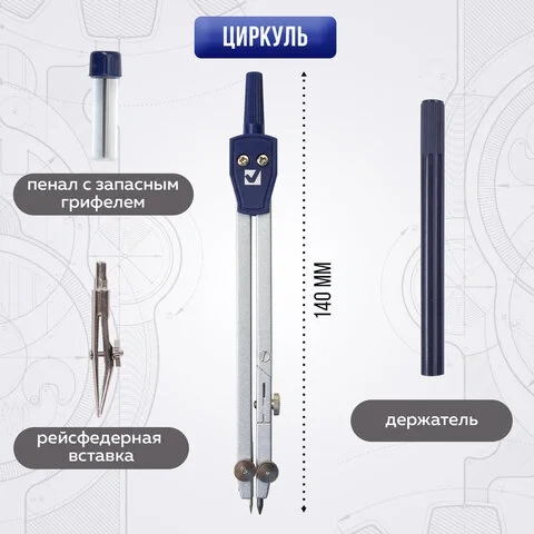 Циркуль длиной 140 мм имеет одну сгибаемую штангу и подстраиваемую иглу. Изготовлен из металла, дополнительный цвет элементов - синий.