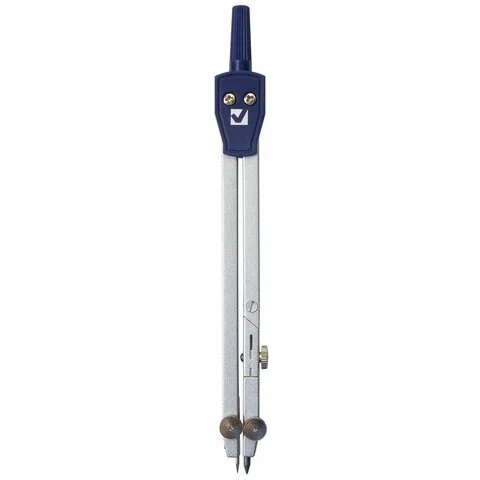 Циркуль длиной 140 мм имеет одну сгибаемую штангу и подстраиваемую иглу. Изготовлен из металла, дополнительный цвет элементов - синий.