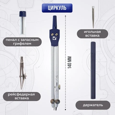 | Комплектация | игольная вставка, пенал с запасным грифелем, рейсфедерная вставка и держатель, циркуль |