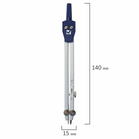 Циркуль длиной 140 мм имеет одну сгибаемую штангу и подстраиваемую иглу. Изготовлен из металла, дополнительный цвет элементов - синий.