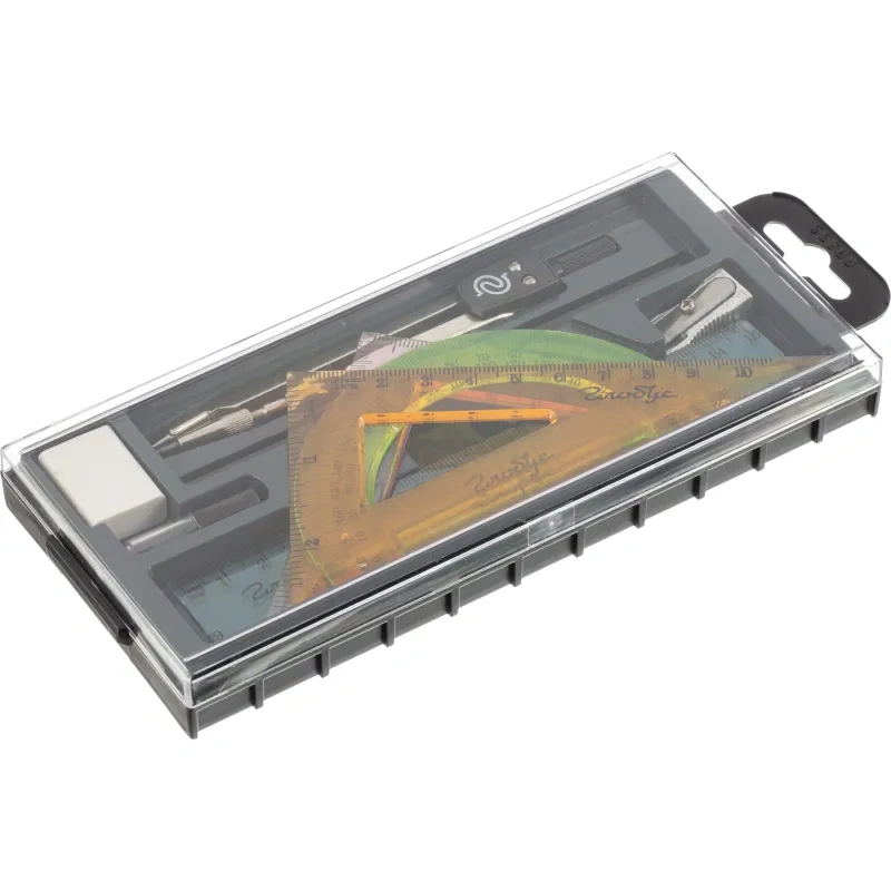 Набор предназначен для чертежных и графических работ, идеально подходит для учебного использования. В комплект входят чертежный циркуль длиной 125 мм из нержавеющего металла, пенал с запасным грифелем, чернографитный карандаш, точилка, ластик, треугольники с углами 30° и 45°, транспортир и линейка длиной 15 см. Циркуль оснащен одной сгибаемой штангой, что обеспечивает точность и удобство работы. Элементы набора выполнены из металла с серебристым покрытием и качественных материалов для аксессуаров. Набор упакован в пластиковый пенал с европодвесом, удобный для хранения и транспортировки. Производитель — Россия. В транспортной упаковке содержится 21 набор.