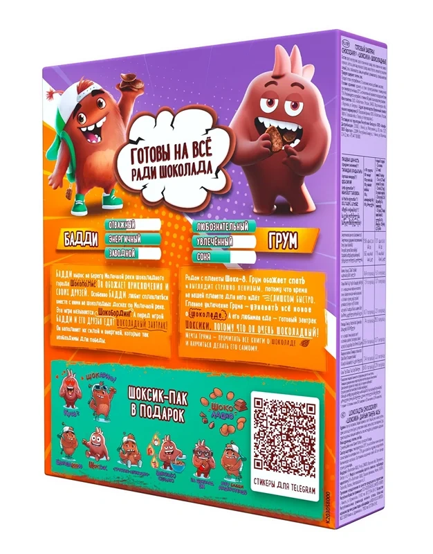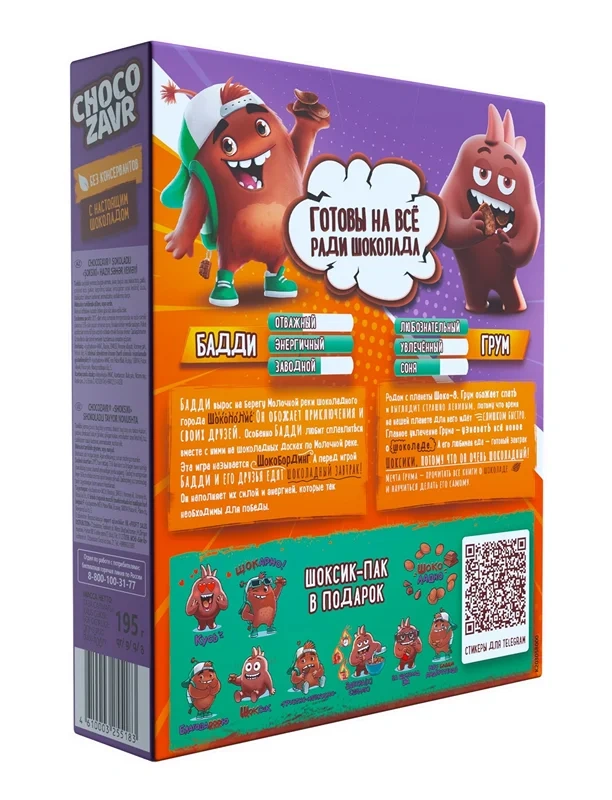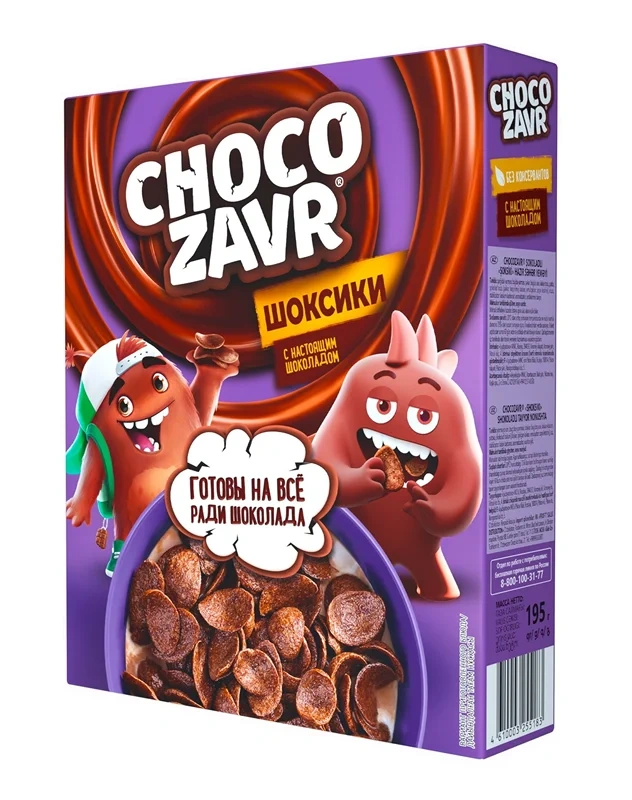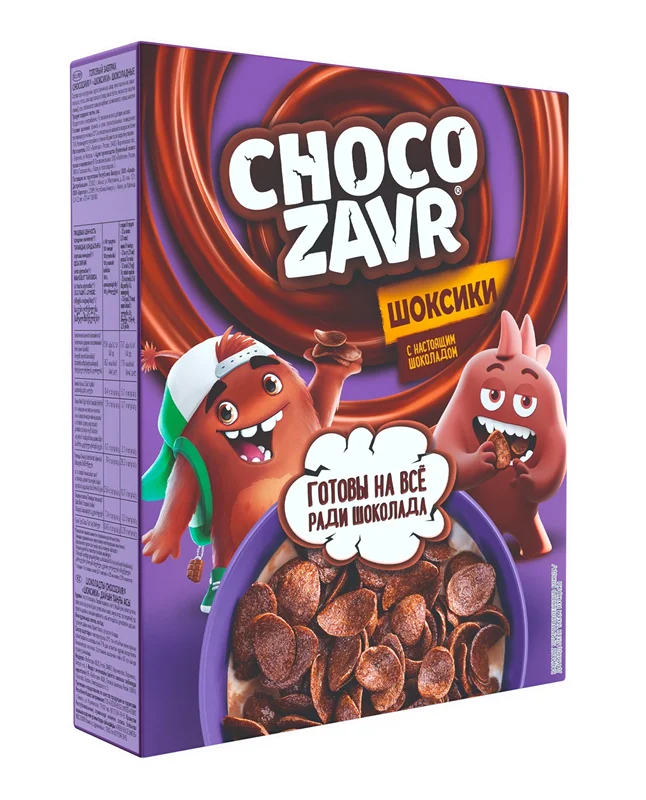 Фигурный готовый завтрак с настоящим шоколадом, без консервантов. Мультизлаковый состав без консервантов и пальмового масла делает этот готовый завтрак невероятно питательным, а тающая начинка - потрясающе вкусным. Подушечки Chocozavr любят и дети, и взрослые, с молоком или просто с чаем.