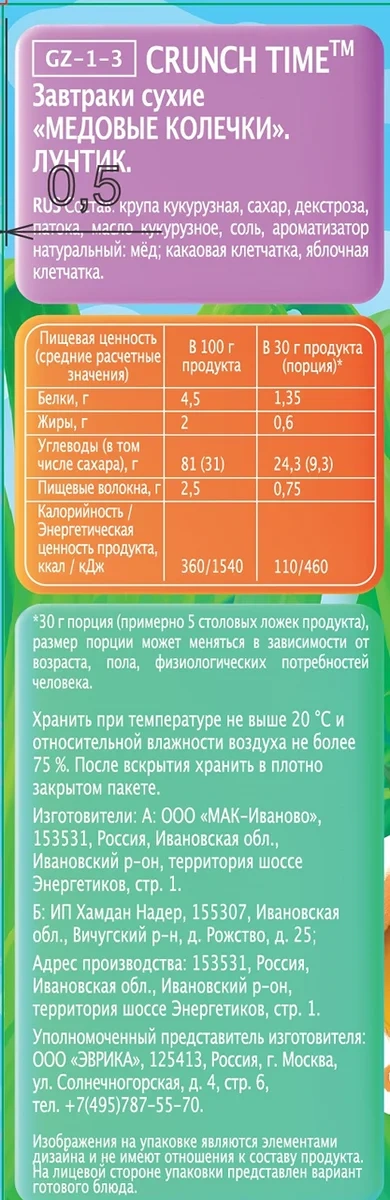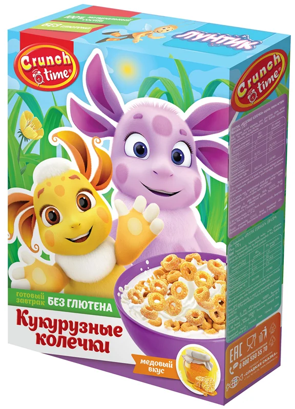 Это хрустящие медовые колечки, которые обожают все дети. Всё, что нужно сделать утром (или даже вечером) — это добавить молоко, йогурт или сок. А можно ничего не добавлять и съесть колечки просто как снеки за просмотром любимого фильма или чтением книги). Хрустящие колечки производятся на собственной российской фабрике из кукурузной крупы и являются 100% натуральным продуктом.