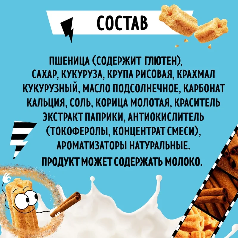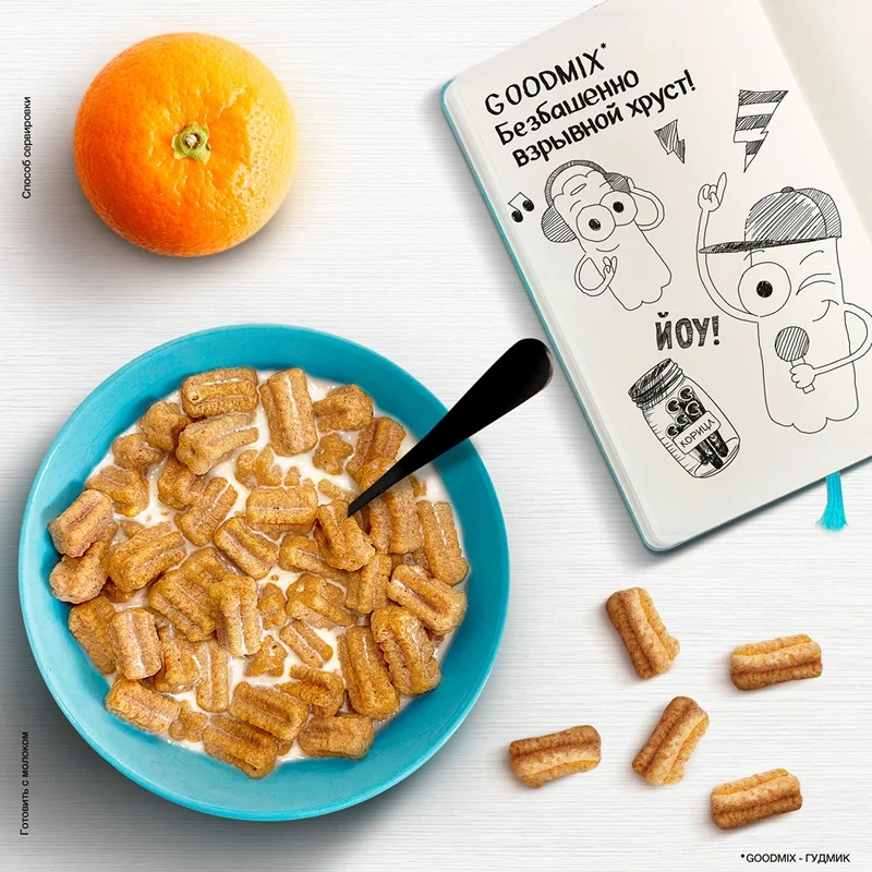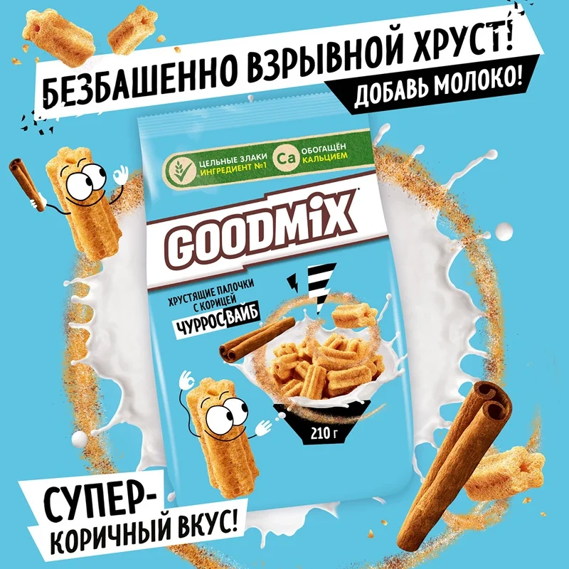 Цельные злаки в составе Goodmix – источник клетчатки и сложных углеводов, которые помогают обеспечить наш организм энергией. Суперкоричный вкус положит начало новым приключениям на целый день! Добавь молоко к хрустящим палочкам, чтобы Суперкоричный вкус раскрылся ещё ярче!