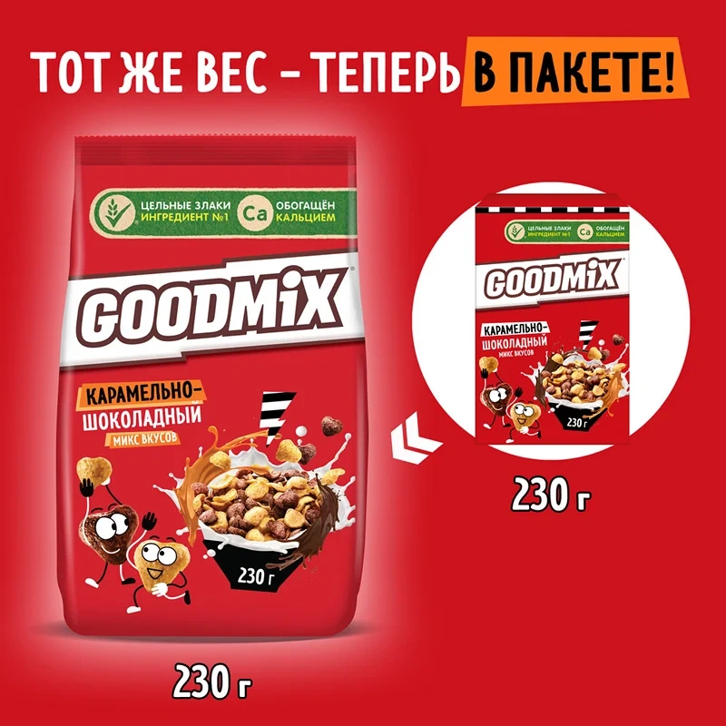 Нет смысла откладывать на потом – открывай для себя незабываемое сочетание мегашоколадного и суперкарамельного вкуса с хлопьями Goodmix здесь и сейчас! Безбашенно вкусно! Цельные злаки в составе хлопьев Goodmix дадут необходимый утром заряд энергии, а невероятный микс вкусов вдохновит на смелые идеи и положит начало ярким впечатлениям предстоящего дня.