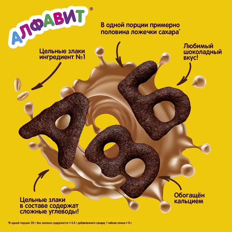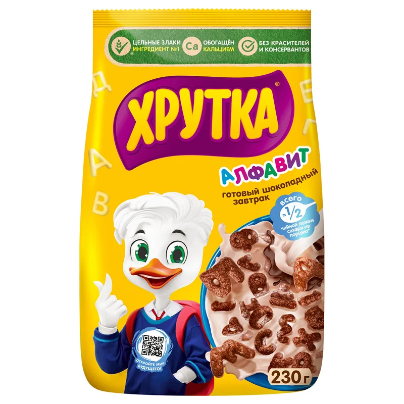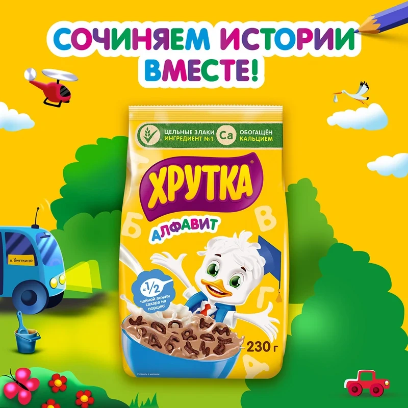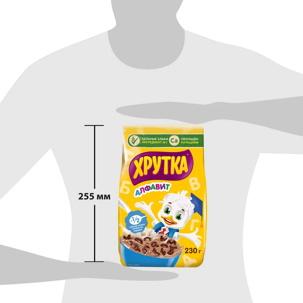 Превратите завтрак в веселую игру вместе с Хрутка Алфавит! Готовый завтрак в виде букв русского алфавита зарядит хорошим настроением с самого утра! Ведь с Хрутка Алфавит можно придумать столько разнообразных историй, которые подарят вдохновение на весь день. Вам не придется выбирать между вкусным и полезным, ведь в составе у Хрутка Алфавит ингредиент №1 – это цельные злаки. Используя все части зерна, мы сохраняем больше полезных веществ. А еще у хрустящих буковок Хрутка любимый шоколадный вкус, и в одной порции завтрака - примерно половина одной чайной ложечки сахара. Готовый завтрак Хрутка Алфавит – это весело, вкусно и полезно!