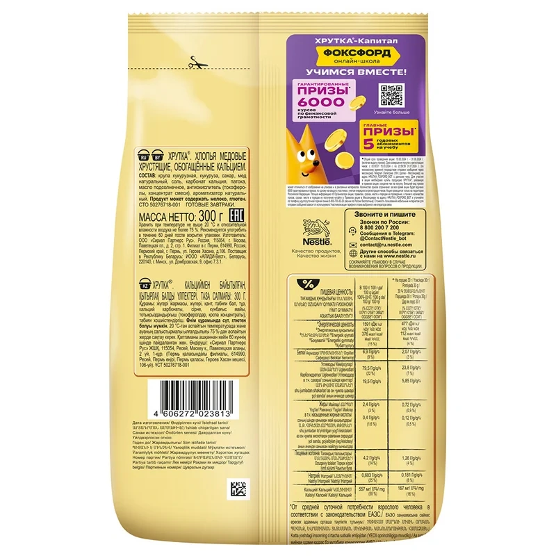 Хлопья медовые Хрутка обогащенные кальцием, 300г это именно то, что вам нужно! Добавьте молоко, йогурт, кефир или сок – и ваше утро начнется со вкусного разнообразного завтрака для всех и каждого! В состав готового завтрака Хрутка Медовые хлопья входят цельные злаки, которые помогают обеспечить организм важными питательными веществами – сложными углеводами, белками и минеральными веществами. Внешняя оболочка цельных злаков (отруби) содержит пищевые волокна, которые способствуют нормальному пищеварению.