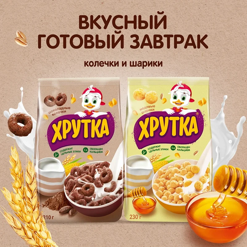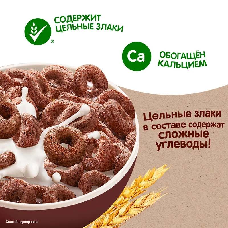 Готовый завтрак Хрутка Шоколадные колечки - это именно то, что вам нужно! Добавьте молоко, йогурт, кефир или сок и ваше утро начнется со вкусного разнообразного завтрака для всех и каждого! В состав готового завтрака Хрутка Шоколадные колечки входят цельные злаки, которые помогают обеспечить организм важными питательными веществами, сложными углеводами, белками и минеральными веществами. Внешняя оболочка цельных злаков (отруби) содержит пищевые волокна, которые способствуют нормальному пищеварению.