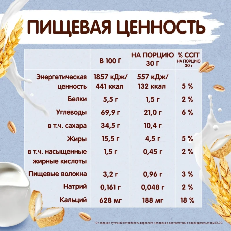 Сахар, крупа рисовая, пшеница (содержит глютен), масло подсолнечное, крахмал кукурузный, молоко сухое обезжиренное (4,2 %), кальция карбонат, соль, эмульгатор (подсолнечный лецитин).