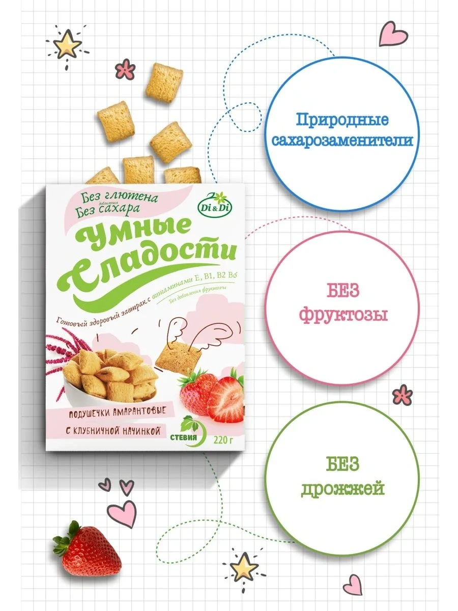 Готовый завтрак Умные сладости Подушечки амарантовые Клубника без сахара без глютена, 220г