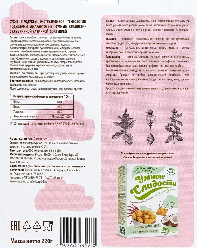 Изготовлены на основе амарантовой, кукурузной и рисовой муки без глютена. Продукт не содержит сахар, а в качестве подсластителя используется изомальт и стевиозид. Это полностью готовый к употреблению продукт и его одинаково любят и взрослые и дети. Показан к применению людям, страдающим диабетом и целиакией. Диетический и диабетический продукт нового поколения на основе натуральных растительных компонентов: стевии и амаранта. Подушечки из амарантовой муки - это продукт здорового питания.