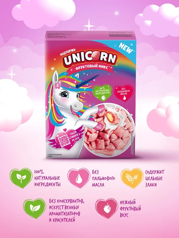 Подушечки Unicorn Фруктовый микс, 200г – готовый завтрак, идеально подходящий для начала нового дня и быстрого перекуса, который наполнит организм энергией и взбодрит. Внутри каждой хрустящей подушечки скрывается нежная фруктовая начинка. Продукт изготовлен из натуральных ингредиентов на основе таких зерновых ингредиентов, как пшеничная крупа, мука и овсяные хлопья. Искусственные консерванты и красители в составе отсутствуют. Для приготовления достаточно залить необходимое количество подушечек йогуртом или молоком. Продукция поставляется в плотной яркой коробке, на оборотной стороне которой вашего ребенка ожидает занимательная игра или раскраска. Хранить необходимо в сухом проветриваемом помещении, соблюдая температурный режим – не выше 20 градусов. Чтобы сохранить свежесть содержимого коробка и пакет необходимо держать в закрытом состоянии. Торговая марка Unicorn принадлежит компании Kellogg's, которая является одним из мировых лидеров по производству готовых завтраков, печений, крекеров и соленых снеков. Годом основания считается 1906 г. Ее основатель открыл рецепт изготовления кукурузных хлопьев более чем 110 лет назад. На российский рынок компания вышла в 2008 г. Сегодня ее ассортиментный ряд насчитывает более 100 наименований. Особое значение придается разработке инновационных продуктов.