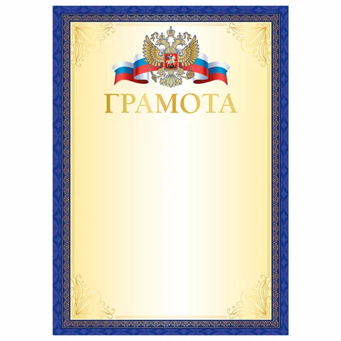 Изготовлена из импортного мелованного картона. Плотность картона в 200 г/м2 позволяет печатать текст на принтере (кроме струйного). Грамота оформлена в соответствии со всеми стандартами, что придает ей официальный статус. Имеется изображение российской символики. Формат А4 позволяет вставить грамоту в рамку и расположить на удобном месте.