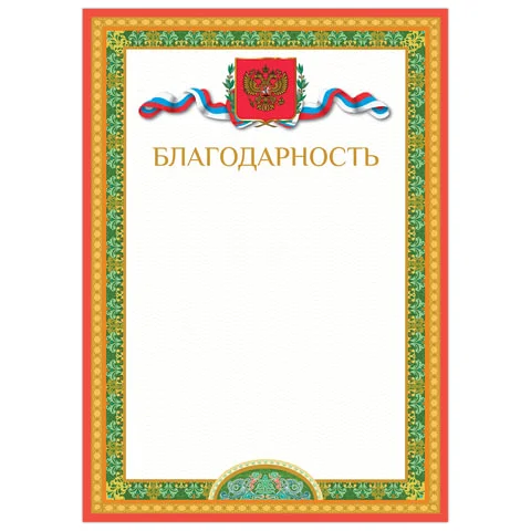 Изготовлено из импортного мелованного картона плотностью 200 г/м2. Символика выполнена с помощью бронзовой краски, что подчеркивает статус и торжественность грамоты. Составляется в свободной форме. Имеется изображение российской символики. Формат А4.