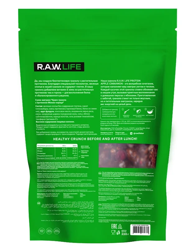 Гранола протеиновая R.A.W. Life яблоко и корица, 220г