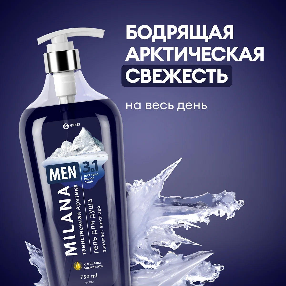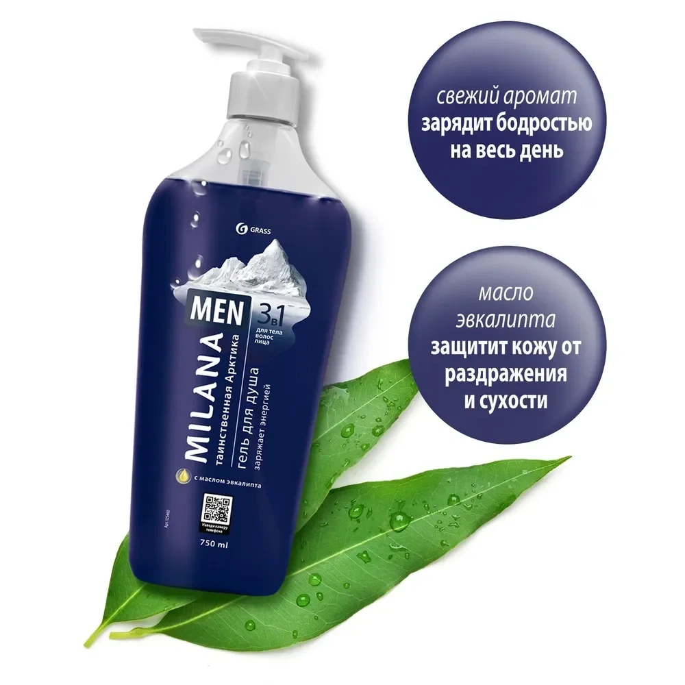 Гель для душа Grass Milana Men Таинственная арктика, 750мл, с маслом эвкалипта