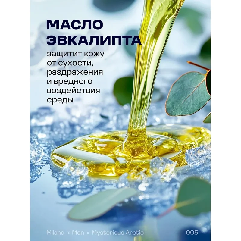 Начни утро с гелем для душа Milana Men Таинственная Арктика — арктическая свежесть зарядит бодростью на весь день. Масло эвкалипта в составе защищает кожу от сухости и раздражения, помогает снизить воздействие негативных факторов окружающей среды. Средство с нейтральным pH подходит для ежедневного ухода за кожей лица, тела и волосами.
