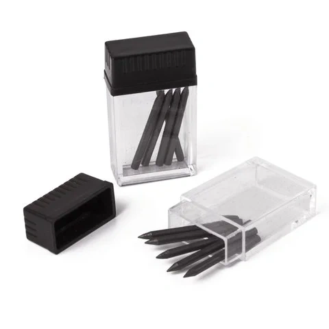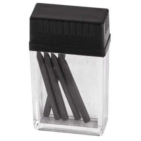 Представляют собой графит средней степени твердости – HB. Длина грифеля составляет 24 мм, а его толщина - 2 мм. 5 штук в упаковке. Поставляются в пластиковой тубе (2 тубы в наборе).