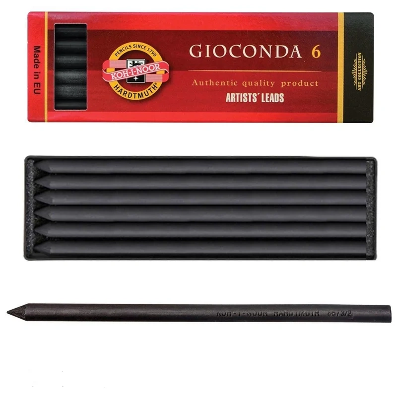 Грифели чернографитные для цанговых карандашей матовые GIOCONDA - это уникальный продукт Koh-I-Noor. Только высококачественные графитовые добавки дают по-настоящему матовый оттенок рисункам. Данные стержни можно использовать самостоятельно, благодаря толщине 5,6, но в цанговом карандаше грифель не пачкает рук, а также снижен риск его поломки. В наборе 6 мягких грифелей (твердость В)