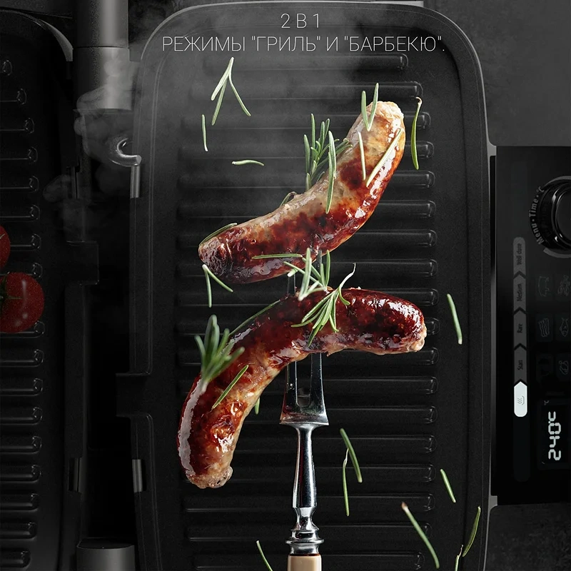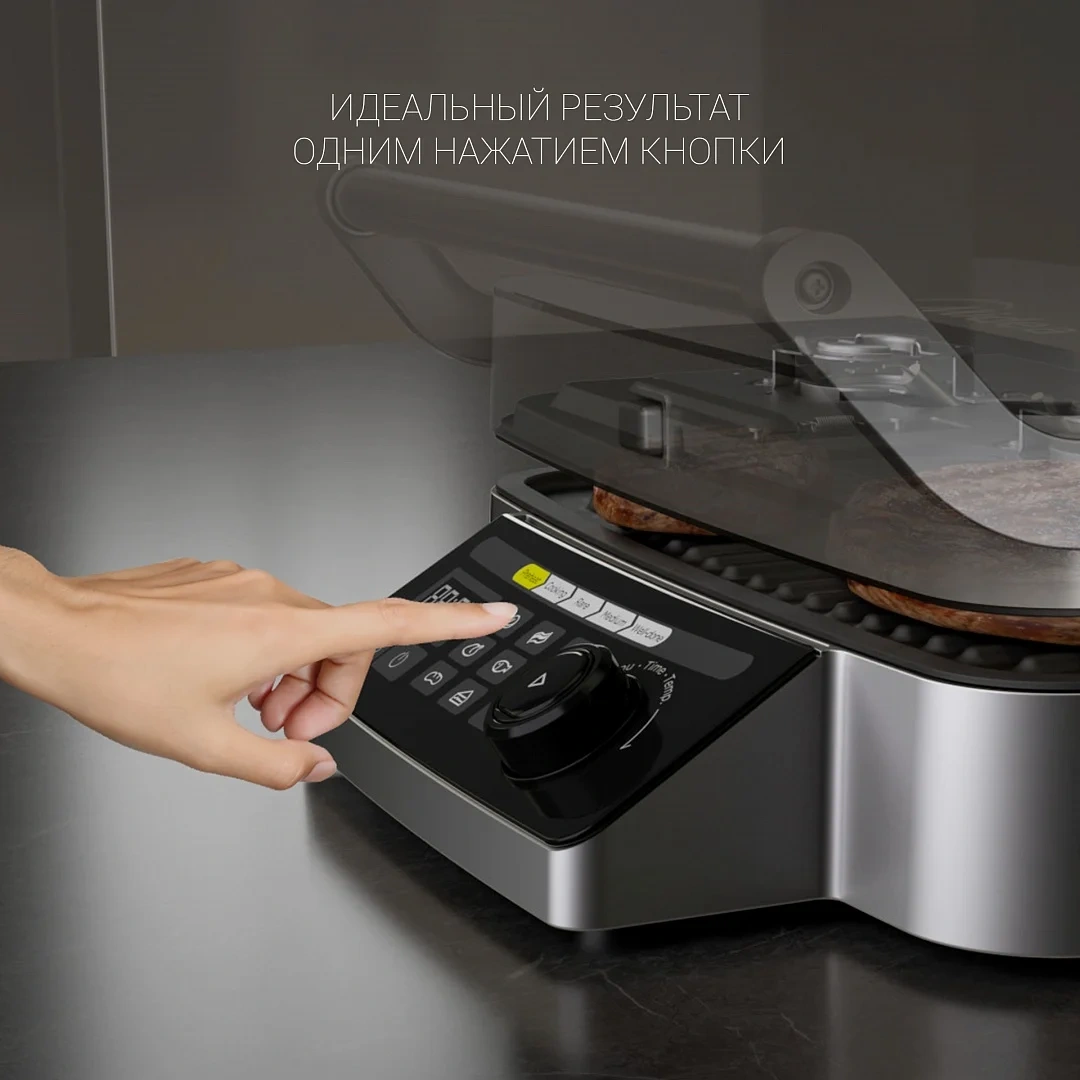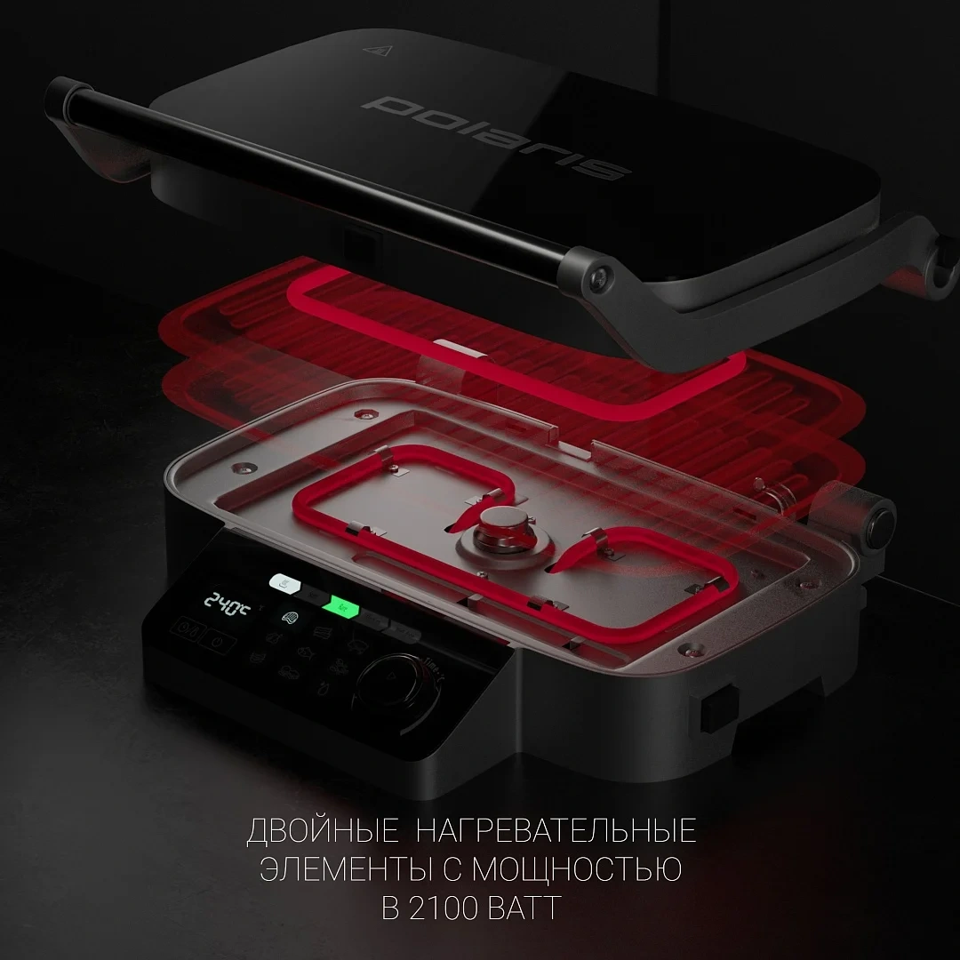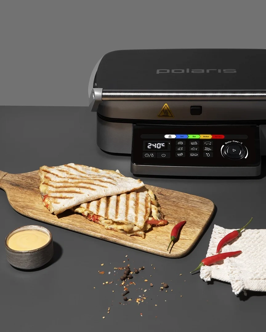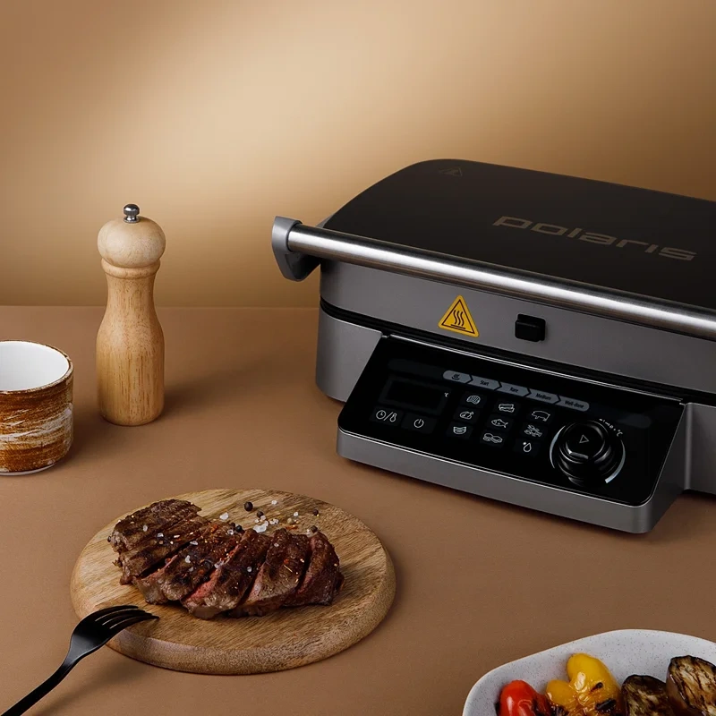 Гриль электрический Polaris PGP 3002DP создан с технологией Optimal Temp для автоматического определения толщины продукта и оптимальной температуры нагрева стейка, шашлыков, свиных ребер, рыбного филе и другого. Прибор подходит для приготовления сочных кусков мяса из говядины, свинины или баранины. Гриль позволяет готовить рыбу или морепродукты: лососевые наггетсы, креветки, мидии. Его можно использовать для запекания овощей или японской версии шашлыка якитори, теппаньяки на плоской поверхности. Из средиземноморской кухни получаются аппетитные кебабы, грильято или морепродукты с хрустящей текстурой. При использовании гриля не понадобится никаких особых навыков. Идеальный результат получается всего одним нажатием кнопки. Прибор запрограммирован на 9 автоматических программ и три степени прожарки: Rare, Medium, Well Done. Всего лишь один девайс готовит как гриль, так и барбекю, одинаково вкусно поджаривает большие куски мяса и небольшие колбаски, купаты или сосиски. Сенсорное управление позволяет без усилий выставлять нужное время, температуру для приготовления того или иного продукта, выбирать предпочтительную степень прожарки. Электрический гриль работает при мощности 2100 Вт. При этом используются две панели, которые обжаривают овощи, рыбу или мясо со всех сторон. Съемные панели легко очищаются от остатков пищи, разводов, жира. Для этого достаточно использовать влажную губку с каплей моющего средства без абразивных частиц. Для удобства использования в устройстве используется поддон, в который стекает жир в процессе приготовления блюд. Корпус модели выполнен из ударопрочных материалов с длительным сроком службы. Они отлично противостоят перепадам температуры, воздействию грязи, влаги и солнечных лучшей. При бережном уходе на корпусе не появляются сколы и потертости.