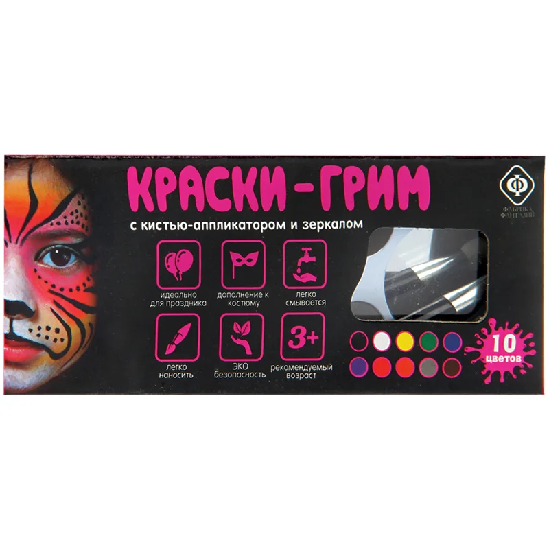 Грим для лица Фабрика Фантазий 10 цветов, с кистью-аппликатором и зеркалом, белая пластиковая палитра